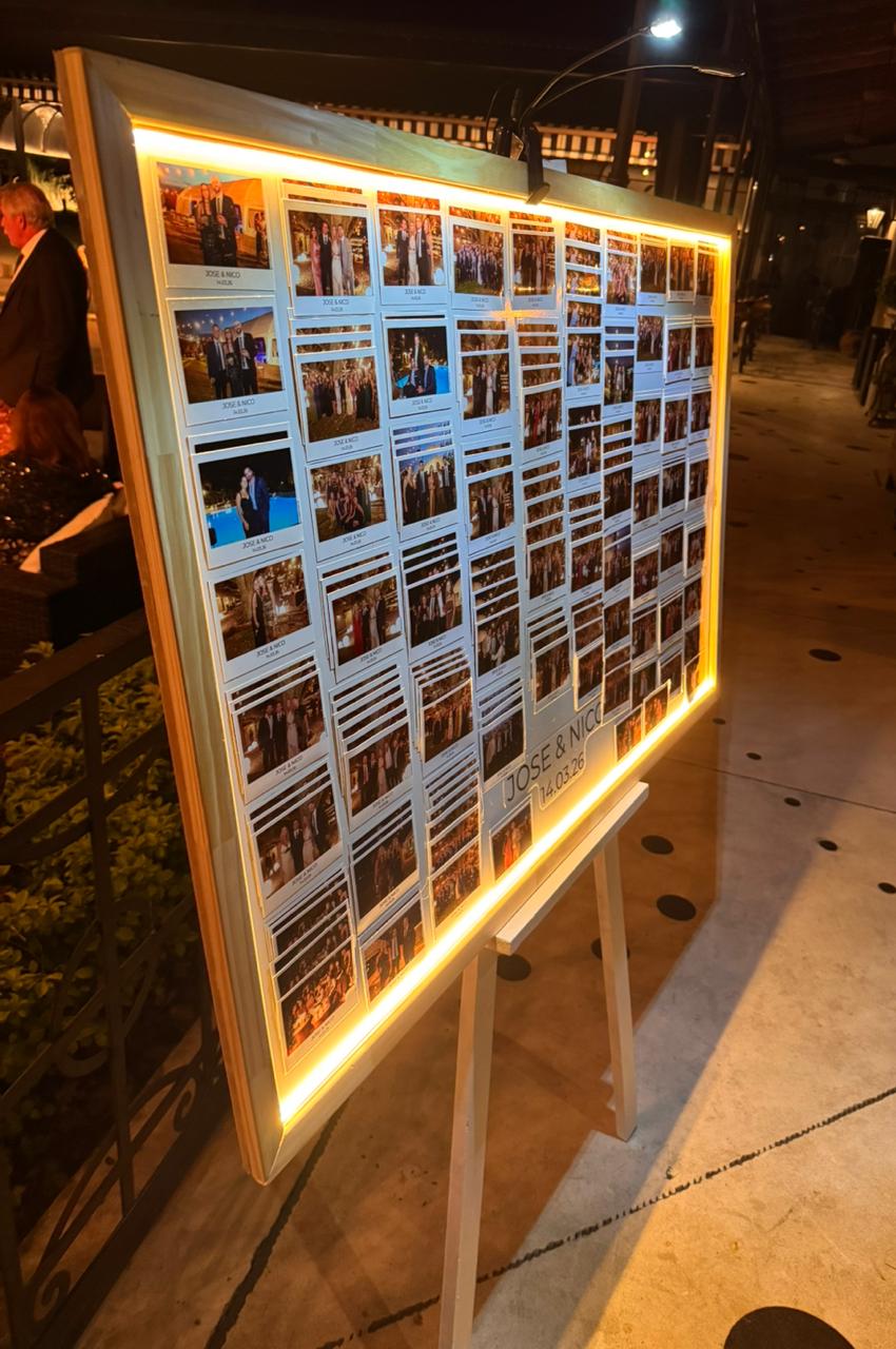 Los fotoimanes son un recuerdo físico del evento que cada invitado puede llevarse. Las fotos se imprimen en papel Kodak, se montan sobre imán y se exhiben para que cada persona elija la suya.